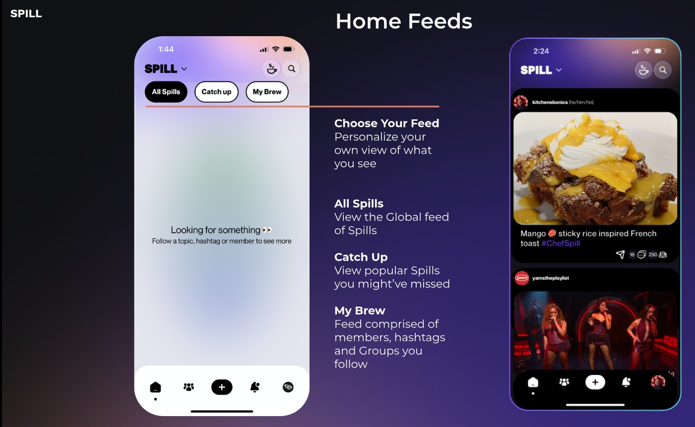 Tap the dropdown beside the SPILL logo to switch between three feed views:
